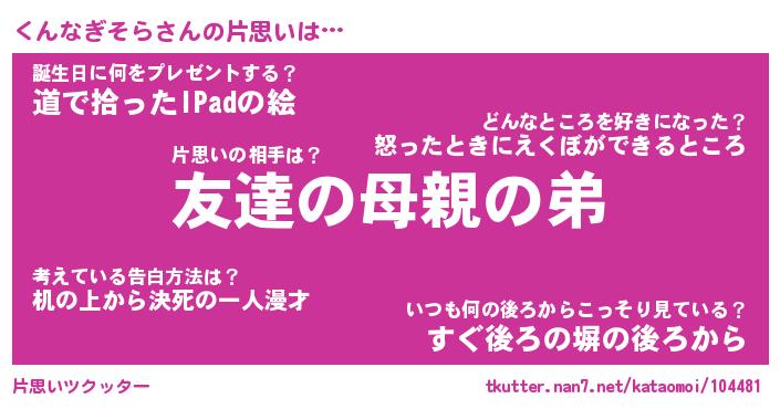 | 胡散臭い通販商品みたいなあだ名 | 『億万長者になれるブレスレット…その名も「くんなぎそら」』 |