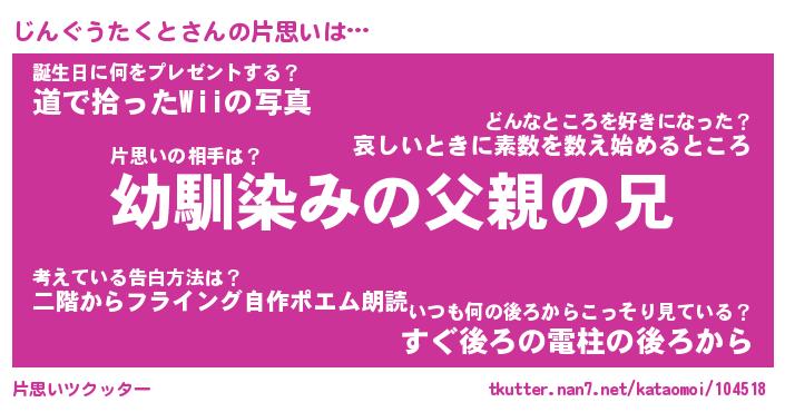| 男性向けラノベタイトル風あだ名 | 『じんぐうたくとの憂鬱』 |
