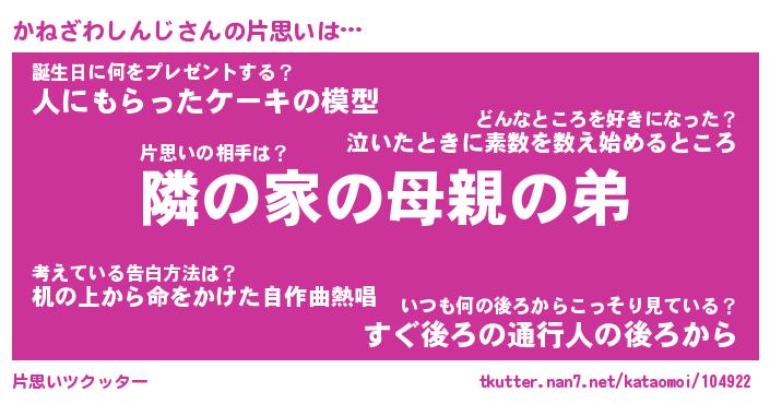 | 男性向けラノベタイトル風あだ名 | 『かねざわしんじの憂鬱』 |