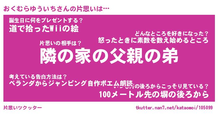 | 男性向けラノベタイトル風あだ名 | 『おくむらゆういちの憂鬱』 |