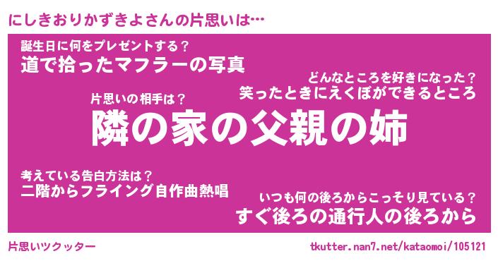 | 男性向けラノベタイトル風あだ名 | 『にしきおりかずきよの憂鬱』 |