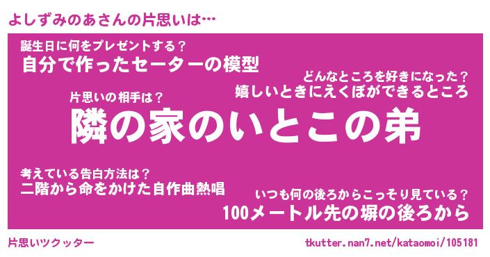 | 伝説のあだ名 | 『伝説のスナイパーよしずみのあ』 |