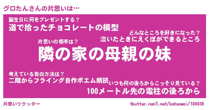 | 胡散臭い通販商品みたいなあだ名 | 『必ず成功するブレスレット…その名も「グロたん」』 |