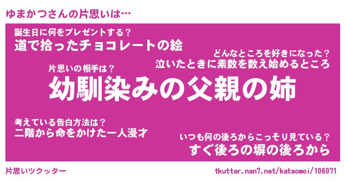 | 男性向けラノベタイトル風あだ名 | 『ゆまかつの憂鬱』 |