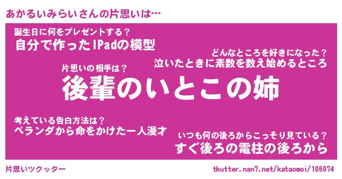 | ヘコむあだ名 | 『あかにゅー』『つくし』『あかを』 |