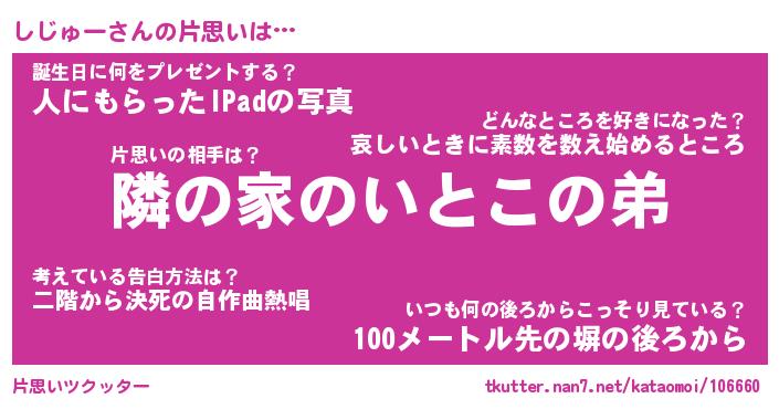 | 男性向けラノベタイトル風あだ名 | 『しじゅーの憂鬱』 |