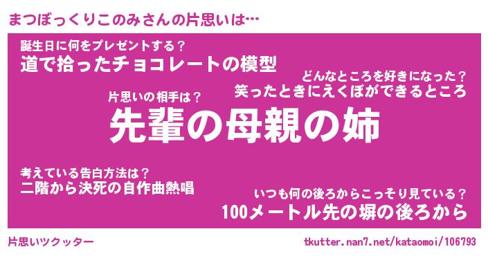 | 男性向けラノベタイトル風あだ名 | 『まつぼっくりこのみの憂鬱』 |