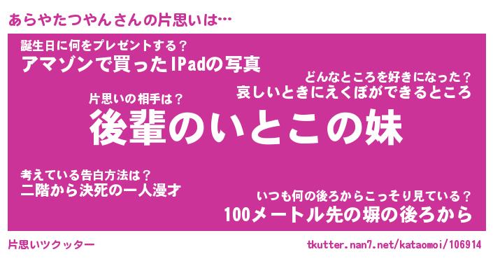 | ツイッター | あらやたつやんさんのツイッターID『namakemono_idle』 |