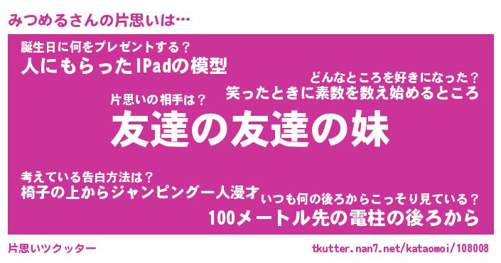 | ヘコむあだ名 | 『みつっふぃ~』『つくし』 |