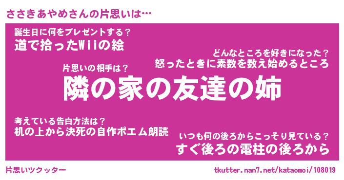 | ヒーロー風カッコイイあだ名 | 『スーパーササキアヤメ』『幻影騎士ササ』 |