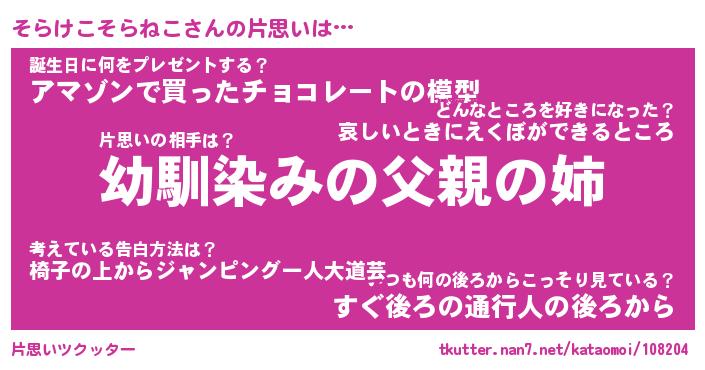 | 男性向けラノベタイトル風あだ名 | 『そらけこそらねこの憂鬱』 |