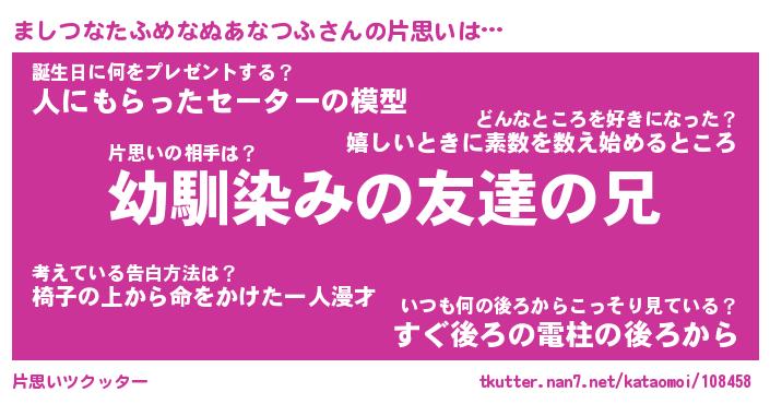 | 男性向けラノベタイトル風あだ名 | 『ましつなたふめなぬあなつふの憂鬱』 |