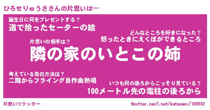 | 伝説のあだ名 | 『伝説のスナイパーひろせりゅうさ』 |