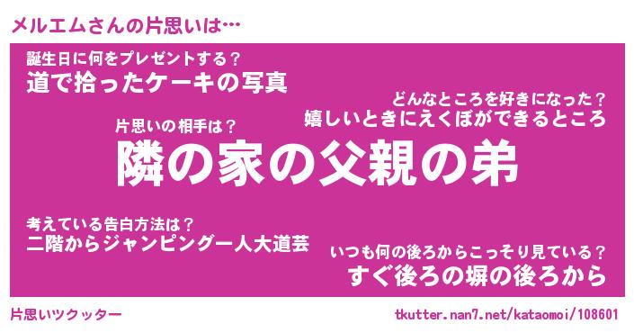 | 胡散臭い通販商品みたいなあだ名 | 『モテモテ間違いなし水晶球…その名も「メルエム」』 |