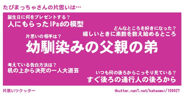 | 男性向けラノベタイトル風あだ名 | 『たぴまっちゃの憂鬱』 |