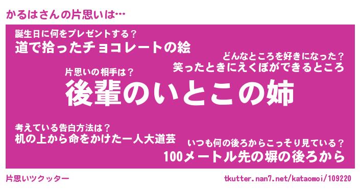 | 意味不明あだ名 | 『ペロリンかるは』『かるはフォーエバー』 |