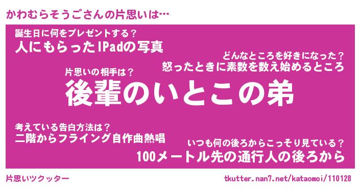 | ツイッター | かわむらそうごさんのツイッターID『dendenmushi_kun』 |