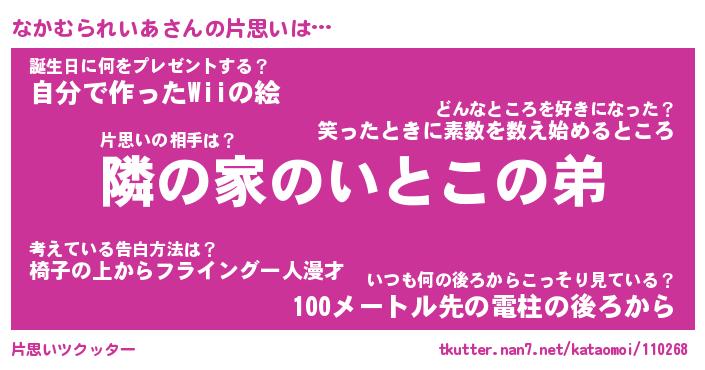 | 胡散臭い通販商品みたいなあだ名 | 『必ず成功する水晶球…その名も「なかむられいあ」』 |