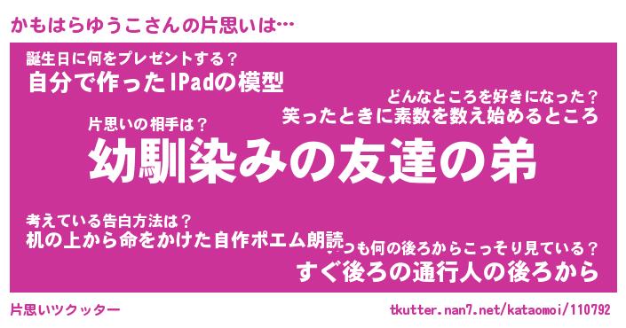 | 女子向けラノベタイトル風あだ名 | 『(仮)かもはらゆうこのやんごとなき事情』 |