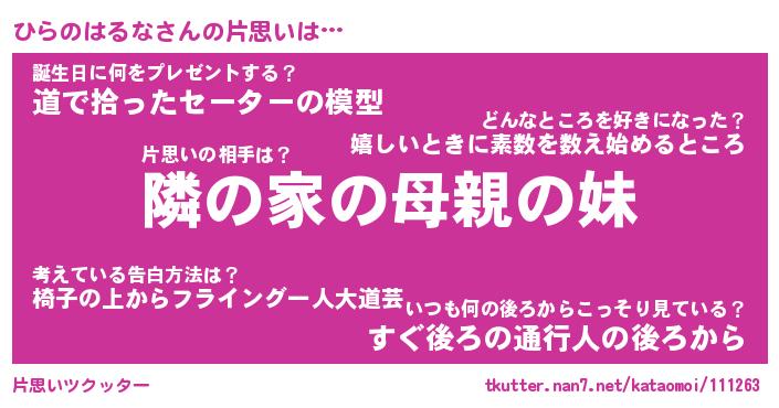 | ヘコむあだ名 | 『ひらにー』『豆乳』『ひらっぺ』 |