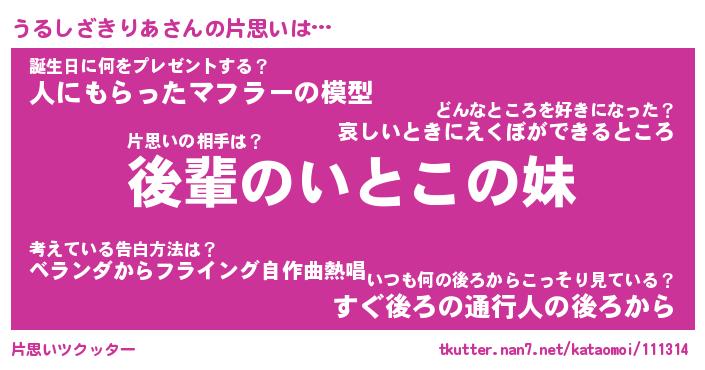 | ツイッター | うるしざきりあさんのツイッターID『dendenmushi_idle』 |