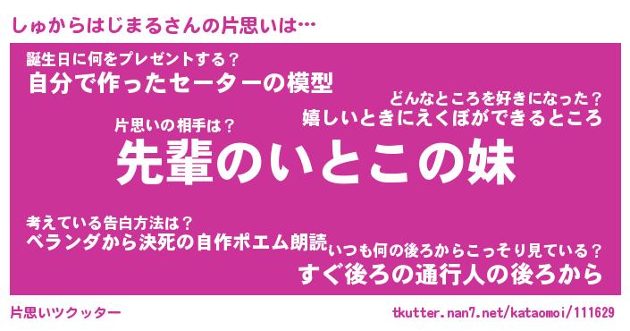 | ツイッター | しゅからはじまるさんのツイッターID『katatsumuri_kun』 |