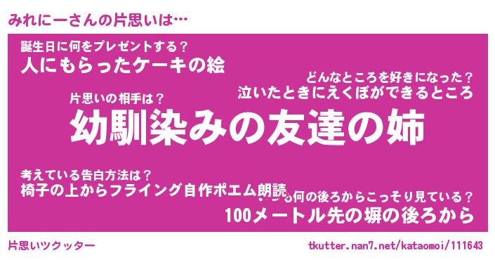 | ヘコむあだ名 | 『みれっふぃ~』『酢こんぶ』 |