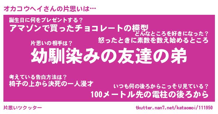 | 男性向けラノベタイトル風あだ名 | 『オカコウヘイの憂鬱』 |