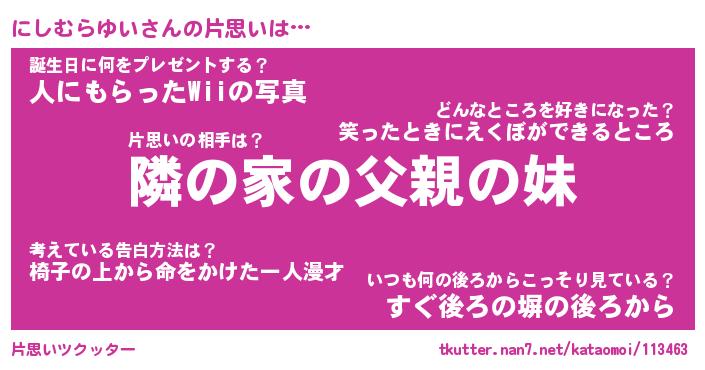 | 恥ずかしいあだ名 | 『プリティーにしむらゆい』『にしっちょ』 |