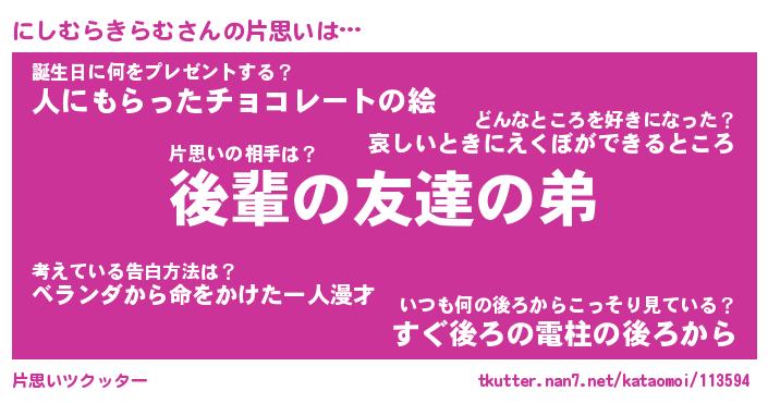 | 女子向けラノベタイトル風あだ名 | 『誰かこのにしむらきらむを説明してください! ~契約から始まるウェディング~』 |