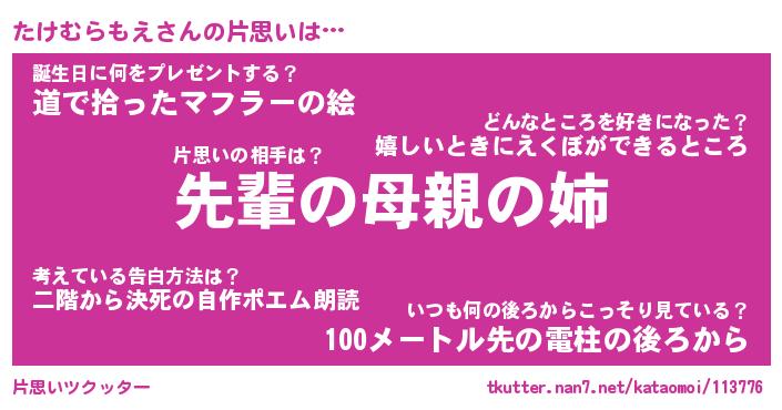 | 恥ずかしいあだ名 | 『プリティーたけむらもえ』『たけっちょ』 |
