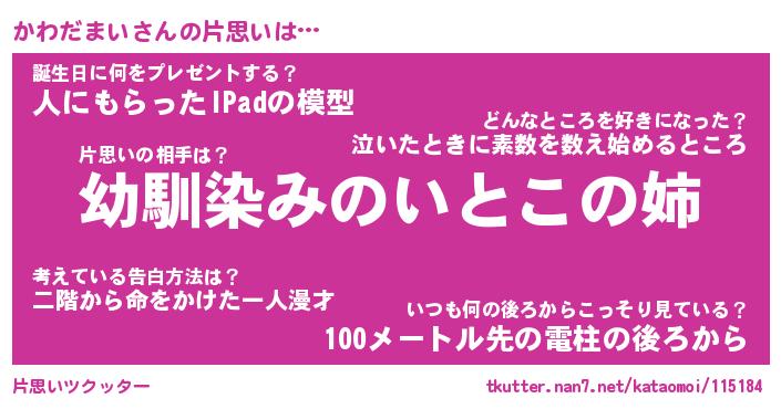 | 女子向けラノベタイトル風あだ名 | 『(仮)かわだまいのやんごとなき事情』 |