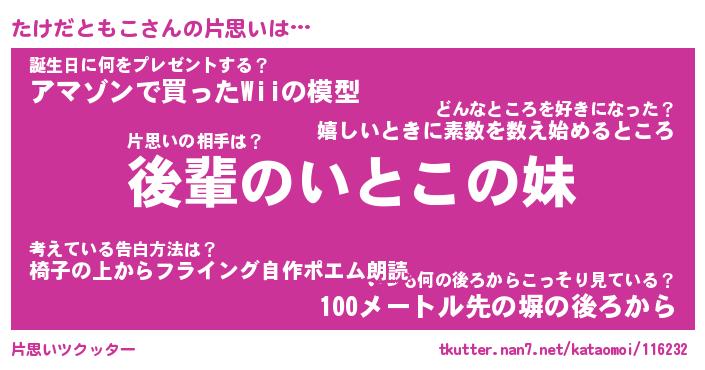 | ヘコむあだ名 | 『たけにゅー』『酢こんぶ』 |
