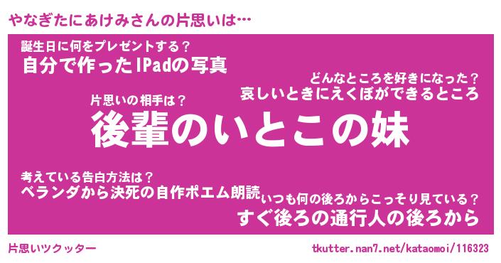 | ツイッター | やなぎたにあけみさんのツイッターID『namakemono_kun』 |