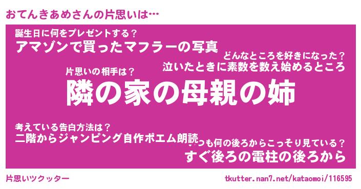 | 男性向けラノベタイトル風あだ名 | 『おてんきあめの憂鬱』 |