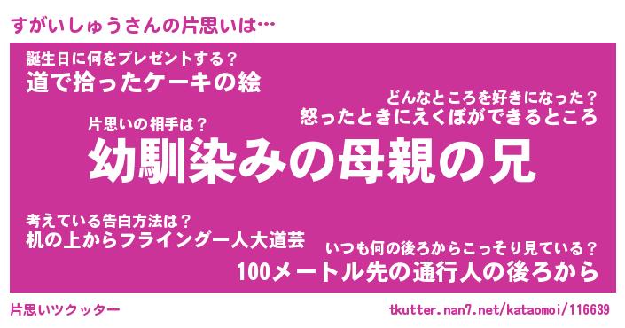| 男性向けラノベタイトル風あだ名 | 『すがいしゅうの憂鬱』 |