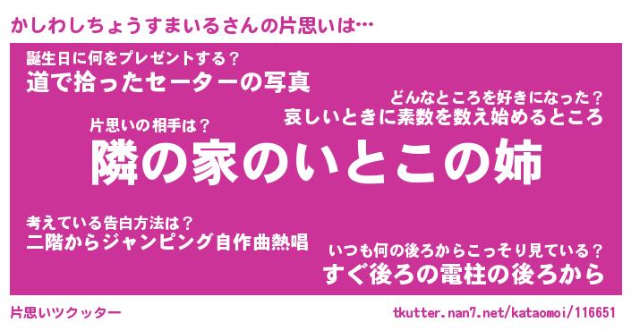 | 胡散臭い通販商品みたいなあだ名 | 『必ず成功する霊験あらたかなお札…その名も「かしわしちょうすまいる」』 |
