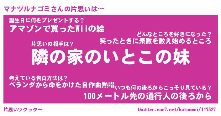 | 男性向けラノベタイトル風あだ名 | 『マナヅルナゴミの憂鬱』 |