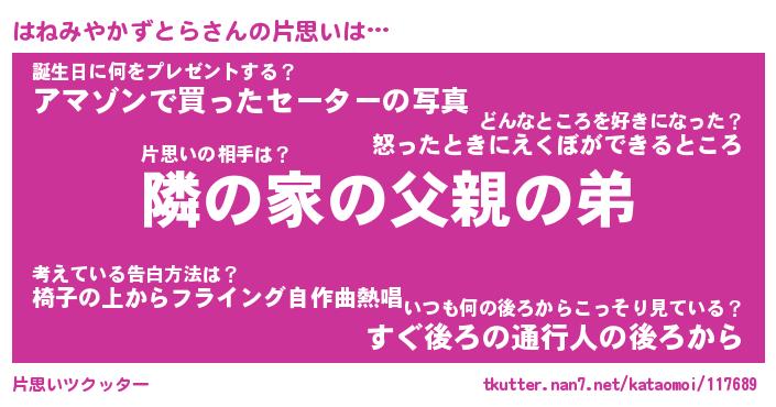 | 女子向けラノベタイトル風あだ名 | 『(仮)はねみやかずとらのやんごとなき事情』 |