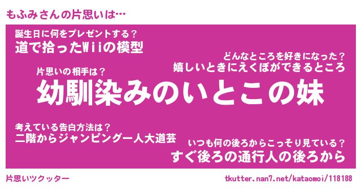 | ヘコむあだ名 | 『もふにゅー』『牛乳』『もふぷりん』 |