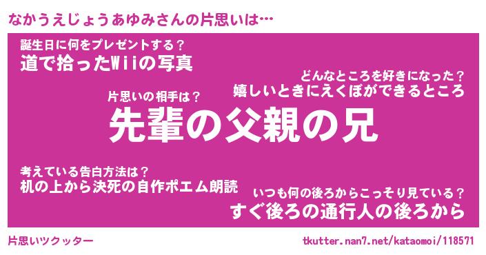 | ツイッター | なかうえじょうあゆみさんのツイッターID『masyumaro_star』 |