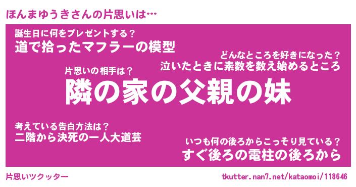 | 女子向けラノベタイトル風あだ名 | 『(仮)ほんまゆうきのやんごとなき事情』 |