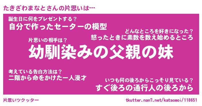 | 男性向けラノベタイトル風あだ名 | 『たきざわまなとの憂鬱』 |