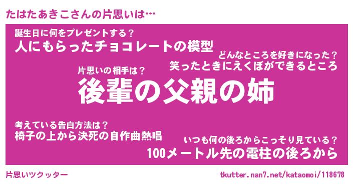 | ヒーロー風カッコイイあだ名 | 『スーパータハタアキコ』『炎刃騎士タハ』 |