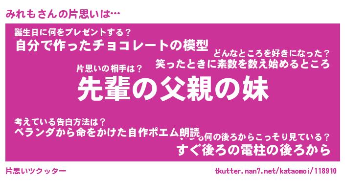 | ヘコむあだ名 | 『みれふぇ~』『つくし』『みれお』 |