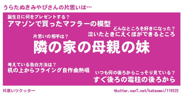 | ヘコむあだ名 | 『うらにー』『なまこ酢』『うらお』 |