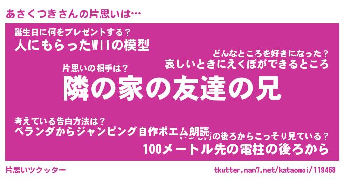 | ヒーロー風カッコイイあだ名 | 『スーパーアサクツキ』『幻影騎士アサ』 |