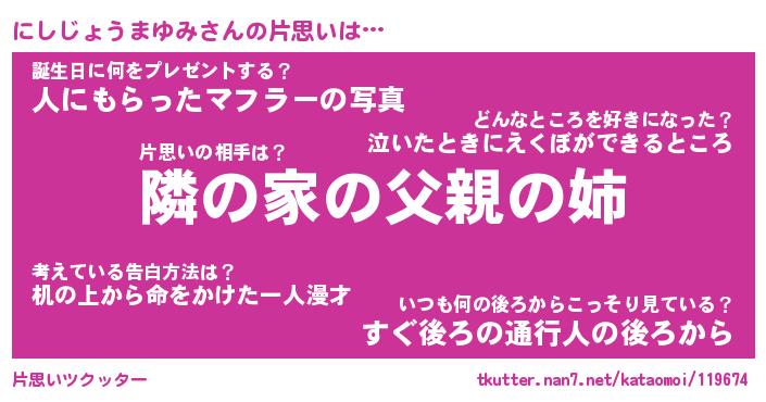 | 男性向けラノベタイトル風あだ名 | 『にしじょうまゆみの憂鬱』 |