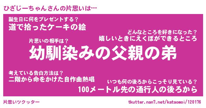 | 男性向けラノベタイトル風あだ名 | 『ひざじーちゃんの憂鬱』 |