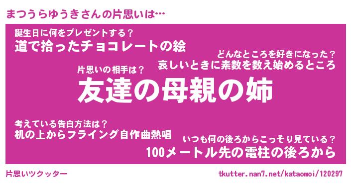 | 女子向けラノベタイトル風あだ名 | 『誰かこのまつうらゆうきを説明してください! ~契約から始まるウェディング~』 |
